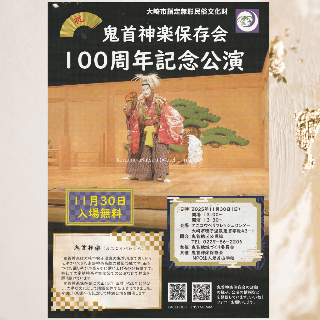 今年100周年を迎える鬼首神楽保存会様の記念公演『大蛇退治』の演目にて使用される、大蛇の小道具の補彩制作を担当いたしました。